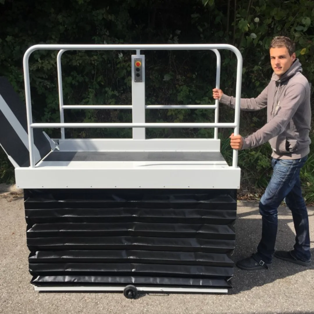 Die Konstruktion besteht aus einem elektrisch angetriebenen Scherensystem, das eine sehr kompakte Konstruktion ermöglicht. Dadurch wird eine Plattformhöhe im eingefahrenen Zustand von 10 -14 cm erreicht und in Verbindung mit der integrierten Auffahrrampe ist keine Schachtgrube für diesen Hublift notwendig.