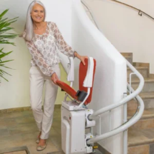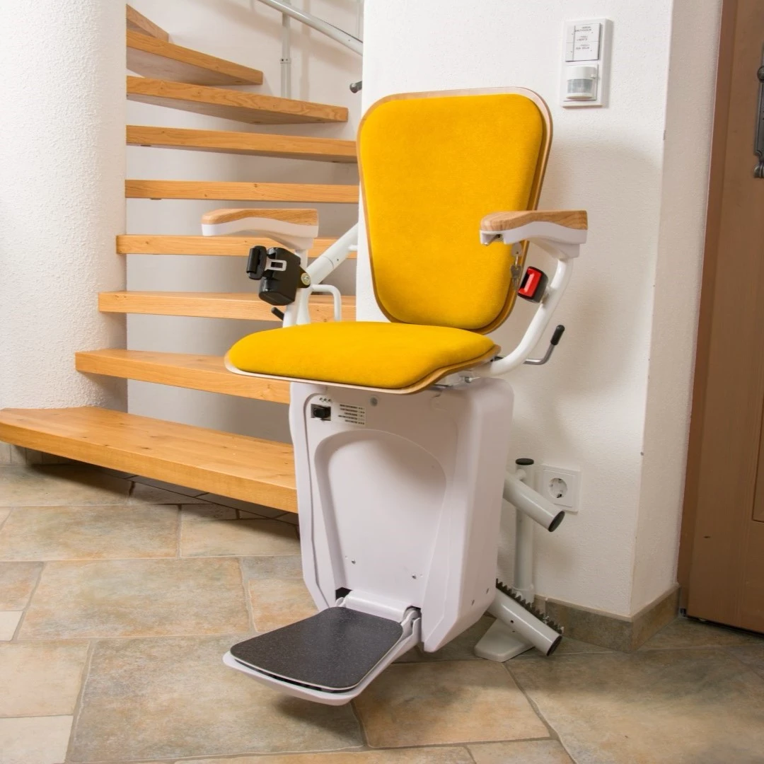 Die Sitzfläche, die Armlehnen und die Fußauflage können platzsparend zusammengeklappt werden, sodass die Treppe für Fußgänger begehbar bleibt. Der Treppenlift ist mit einem Sitzgurt sowie Sicherheitsschaltern für eine sichere Fahrt ausgerüstet. Im Lift sind Akkus integriert, sodass der Lift im Falle eines Stromausfalls nicht stehen bleibt. Für die Farbe des Sitzpolsters stehen sechs verschiedene Farben zur Auswahl. Die Polsterfläche ist aus Kunstleder und somit gut abwischbar.